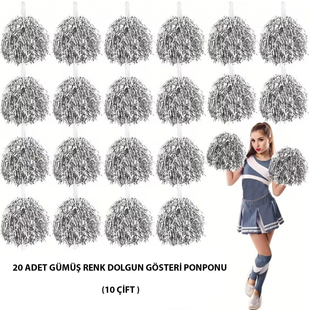 Okul gösterileriniz ve özel gün etkinlikleriniz için ışıltılı ve şık bir seçim! Bu 10 çift (20 adet) gümüş renk ponponlar, 23 Nisan, 19 Mayıs ve 29 Ekim gibi milli bayramlar ile okul kutlamalarında mükemmel bir şekilde kullanılabilir.Öne Çıkan Özellikler: Renk: Gümüş, gösterilerde dikkat çekici parlaklık Adet: 10 çift (toplam 20 ponpon) Kullanım Alanı: Okul gösterileri, törenler, dans ve koreografi aktiviteleri Malzeme: Hafif ve dalı, öğrenciler için güvenli Kolay Kullanım: Eller için uygun boyut ve rahat tutuş Özel günlerde etkinliklerinizi daha canlı ve renkli hale getirin! Öğrencilerinizin performansını tamamlayacak parlak ponponlarla gösterilerinizi unutulmaz kılın.