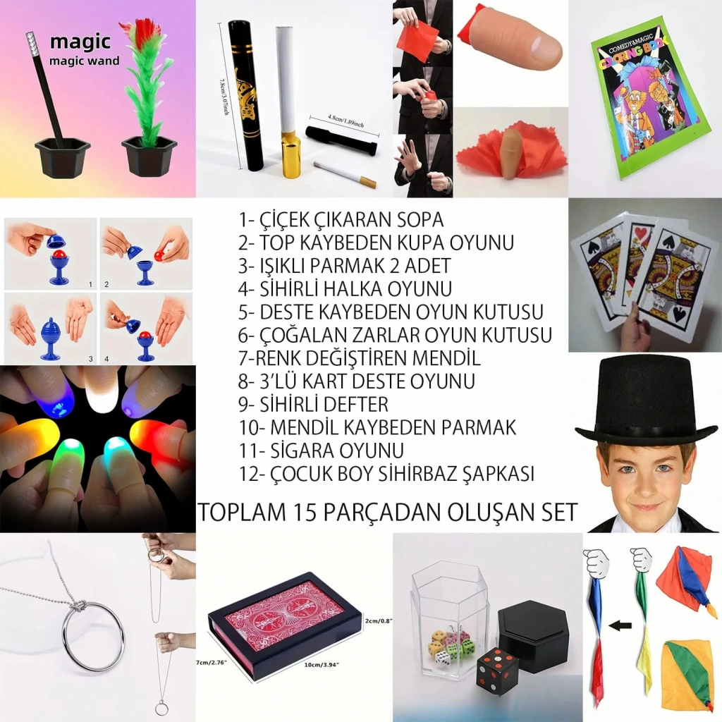 Çocukların hayal gücünü geliştiren ve eğlenceli vakit geçirmelerini sağlayan 15 parçalık sihirbazlık seti, sihir dünyasına adım atmak isteyen minikler için harika bir başlangıçtır.Setin içinde ışıklı parmaklar, renk değiştiren mendil, çiçek çıkaran sopa, sihirli kartlar, şapka ve daha birçok eğlenceli numara bulunmaktadır. Çocuklar hem arkadaşlarına hem de ailelerine gösteriler yaparak tıcılıklarını ve özgüvenlerini artırabilir.Ürün Özellikleri: Toplam: 15 parça sihirbazlık ve illüzyon oyunu Çocuk boy sihirbaz şapkası dahil Kolay öğrenilen ve eğlenceli numaralar Doğum günü, yılbaşı ve parti hediyesi için ideal Bu set ile küçük sihirbazlar sahnenin yıldızı olacak!