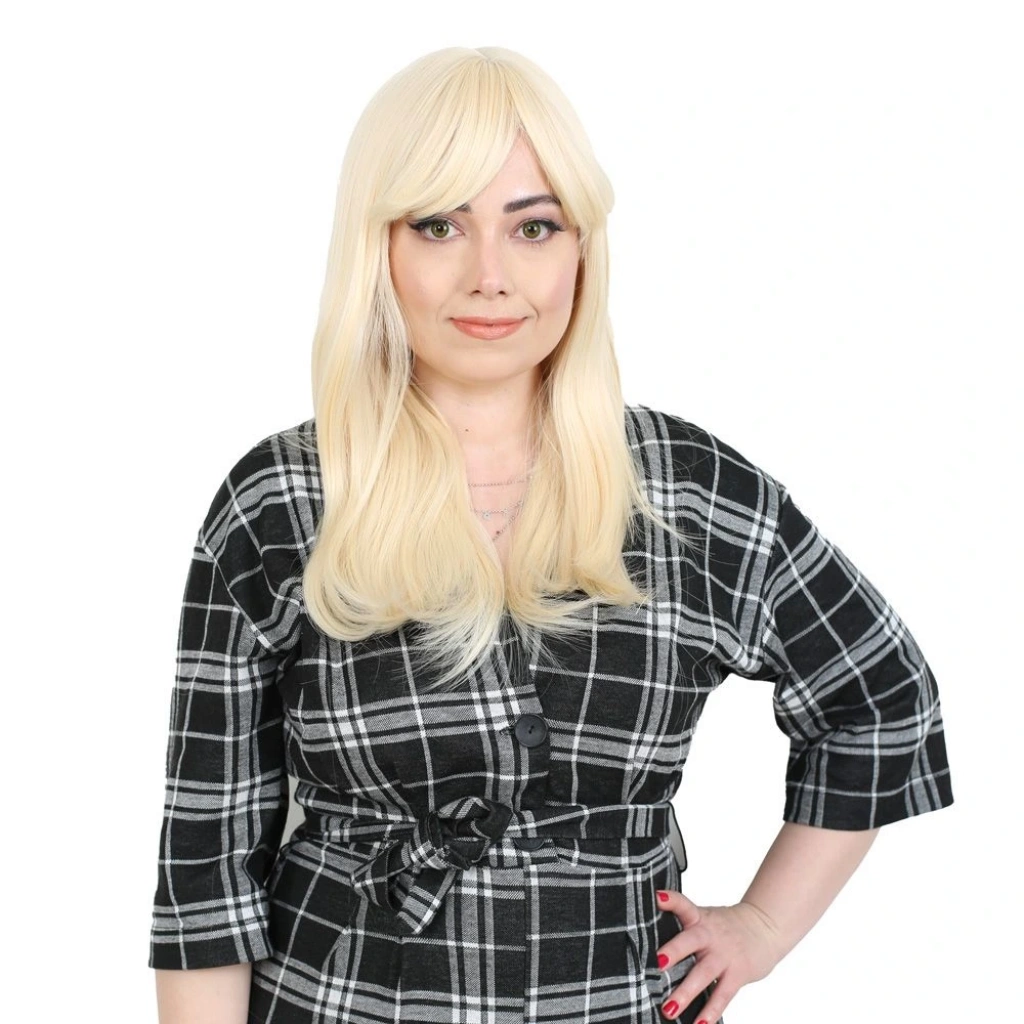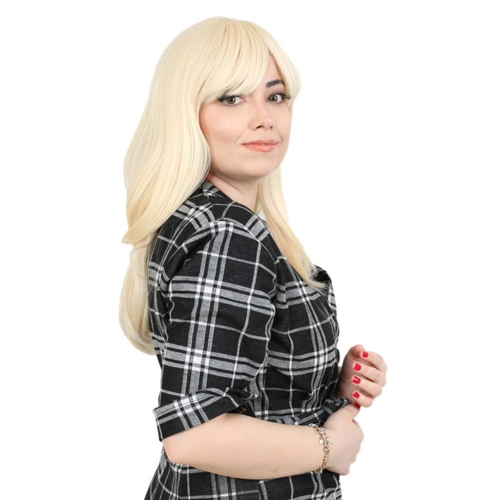 Düz Perçemli Orta Boy Fiber Sentetik Peruk - Platin1.Sınıf fiber sentetiktir.Orta boy, düz ve perçemli bir modeldir.Tepe hariç 45 - 50 cm ve 210 - 230 gr civarındadır.Gerçek görünüme yakındır ve parlama yapmaz.Üst tepe kısmı deri görünümlüdür.İçi filelidir, hava alabilen özel bir yapısı vardır.İç arka kısmında baş ölçünüze göre ayarlanabilir kopçaları mevcuttur, her kafa yapısına uyum sağlayabilir.Takmadan önce saçlarınızı bir bone ile toplayıp kapatırsanız, kayma veya düşme gibi sorunlarla karşılaşmazsınız.130-140 dereceyi geçmemesi koşuluyla maşa ve fön uygulanabilir.Düzleştirebilirsiniz.Yıkanabilir, taranabilir.Ilık ve kremli bir su karışımı içinde durulayıp yıkayabilirsiniz.Yıkama sonrasında kurumaya bırakın,kuruduktan sonra mavi su sıkıp uçlardan dibe doğru hafifçe tarayınız, sonrasında kullanabilirsiniz,yada bir kafa mankeni üzerinde muhafaza edebilirsiniz.Tülerme, elektriklenme vb. problemlerin önüne geçmek için; her takıp çıkardıktan sonra mavi su sıkıp taramanızı tavsiye ederiz.