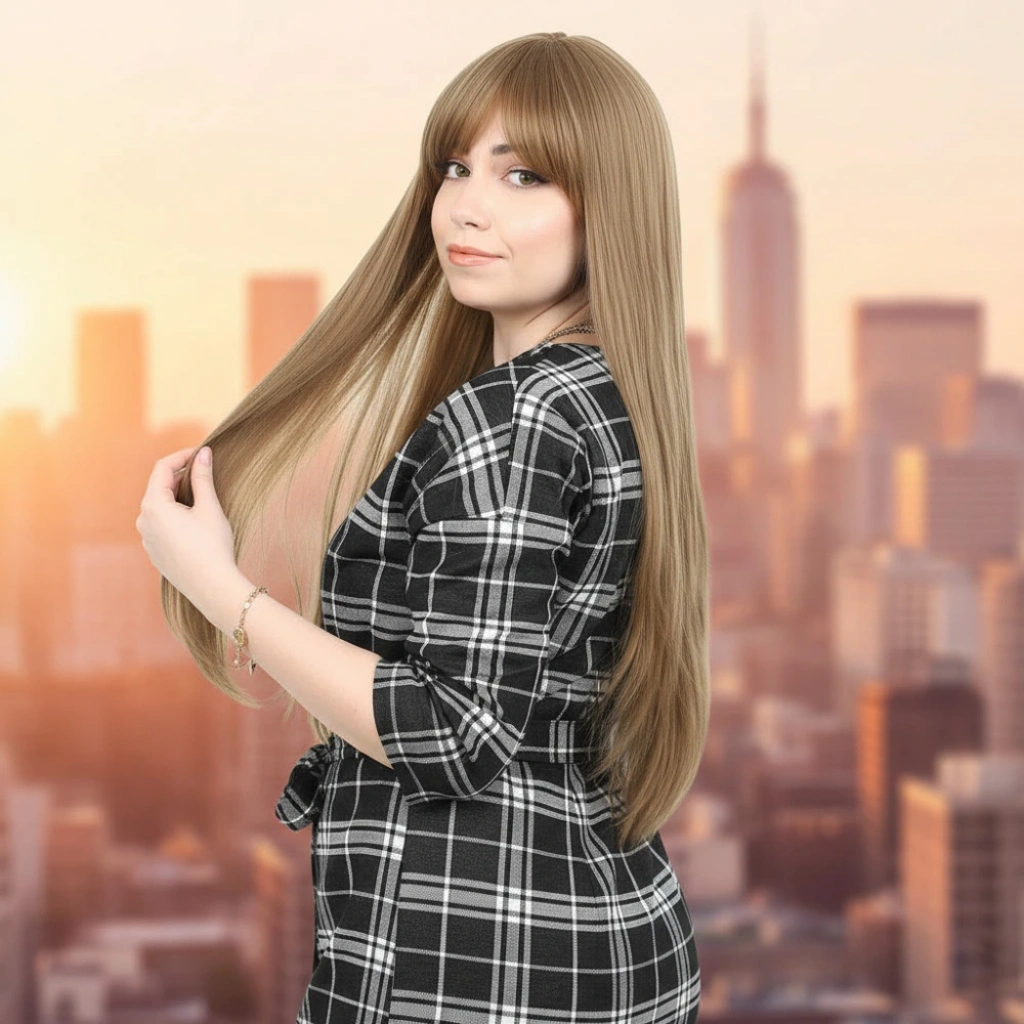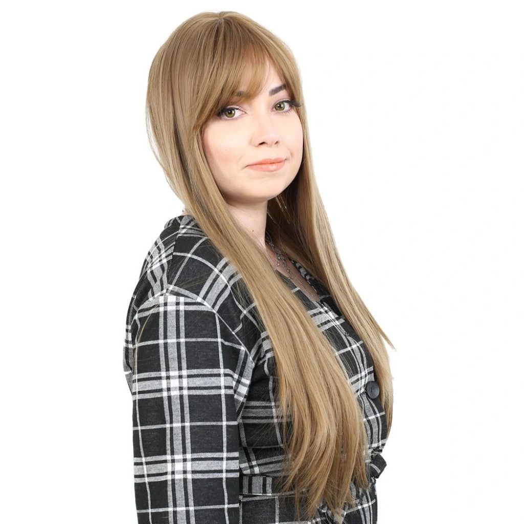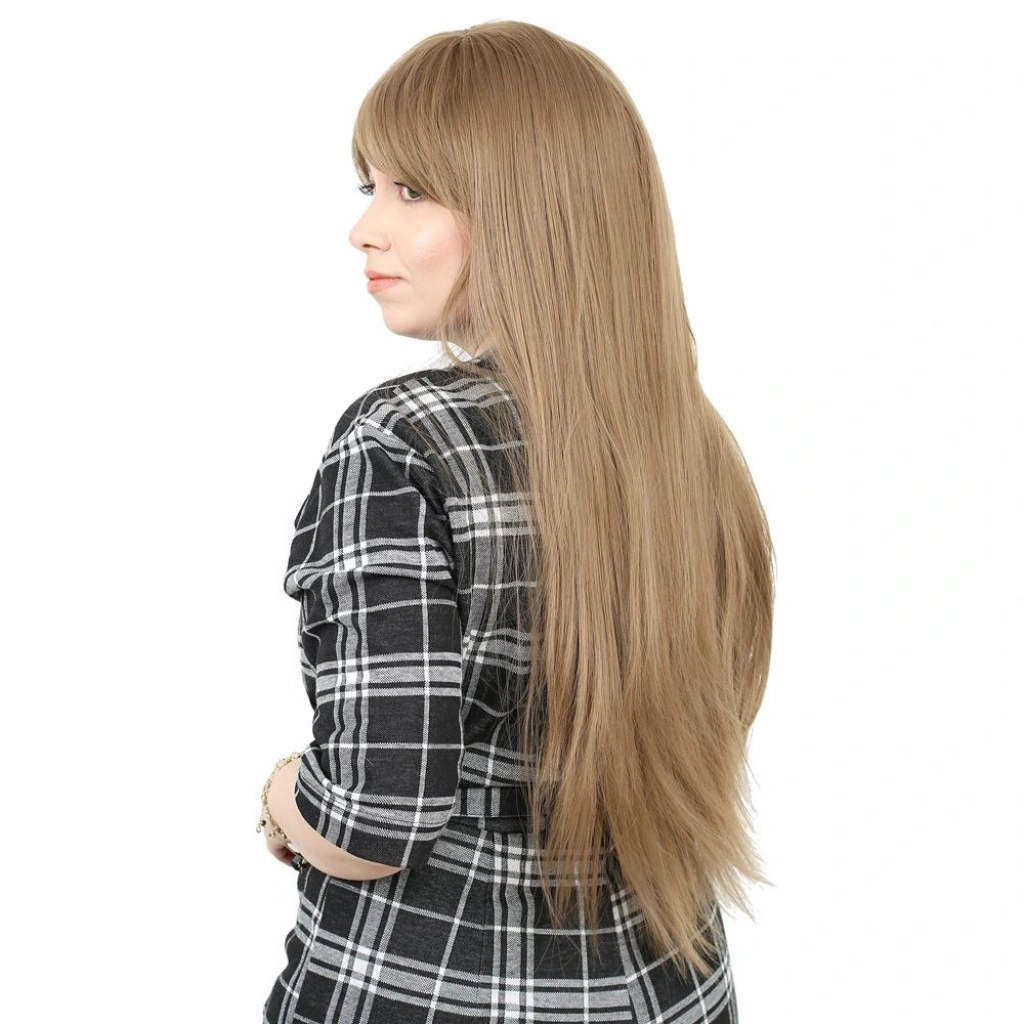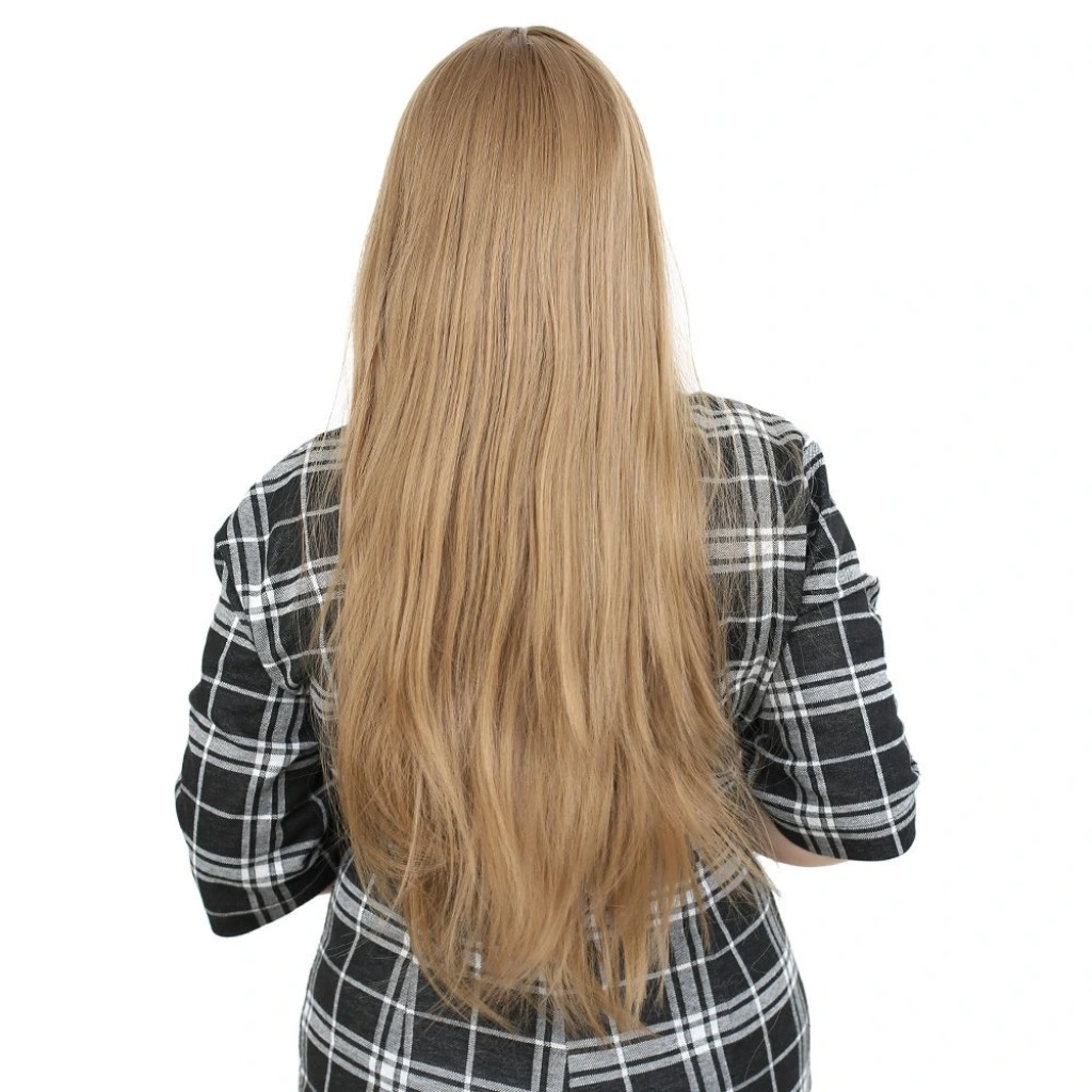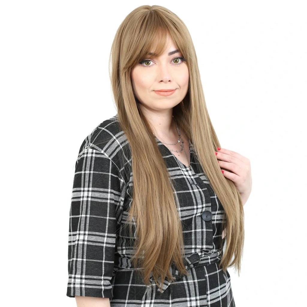 Fiber Sentetik Uzun Düz Kahküllü Peruk - Bebek Kumralı1.Sınıf fiber sentetiktir.Uzun, düz ve kahküllü bir modeldir.Tepe hariç 65 cm ve sadece saç 260 gr civarındadır.Gerçek görünüme yakındır ve parlama yapmaz.İçi filelidir, hava alabilen özel bir yapısı vardır.İç arka kısmında baş ölçünüze göre ayarlanabilir kopçaları mevcuttur, her kafa yapısına uyum sağlayabilir.Takmadan önce saçlarınızı bir bone ile toplayıp kapatırsanız, kayma veya düşme gibi sorunlarla karşılaşmazsınız.130-140 dereceyi geçmemesi koşuluyla maşa ve fön uygulanabilir.Düzleştirebilirsiniz.Yıkanabilir, taranabilir.Ilık ve kremli bir su karışımı içinde durulayıp yıkayabilirsiniz.Yıkama sonrasında kurumaya bırakın,kuruduktan sonra mavi su sıkıp uçlardan dibe doğru hafifçe tarayınız, sonrasında kullanabilirsiniz,yada bir kafa mankeni üzerinde muhafaza edebilirsiniz.Tülerme, elektriklenme vb. problemlerin önüne geçmek için; her takıp çıkardıktan sonra mavi su sıkıp taramanızı tavsiye ederiz.