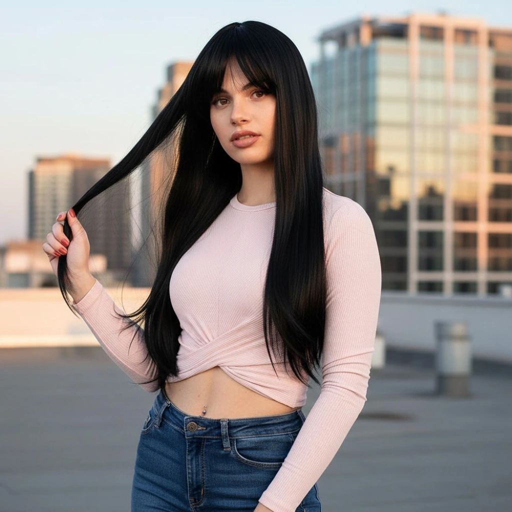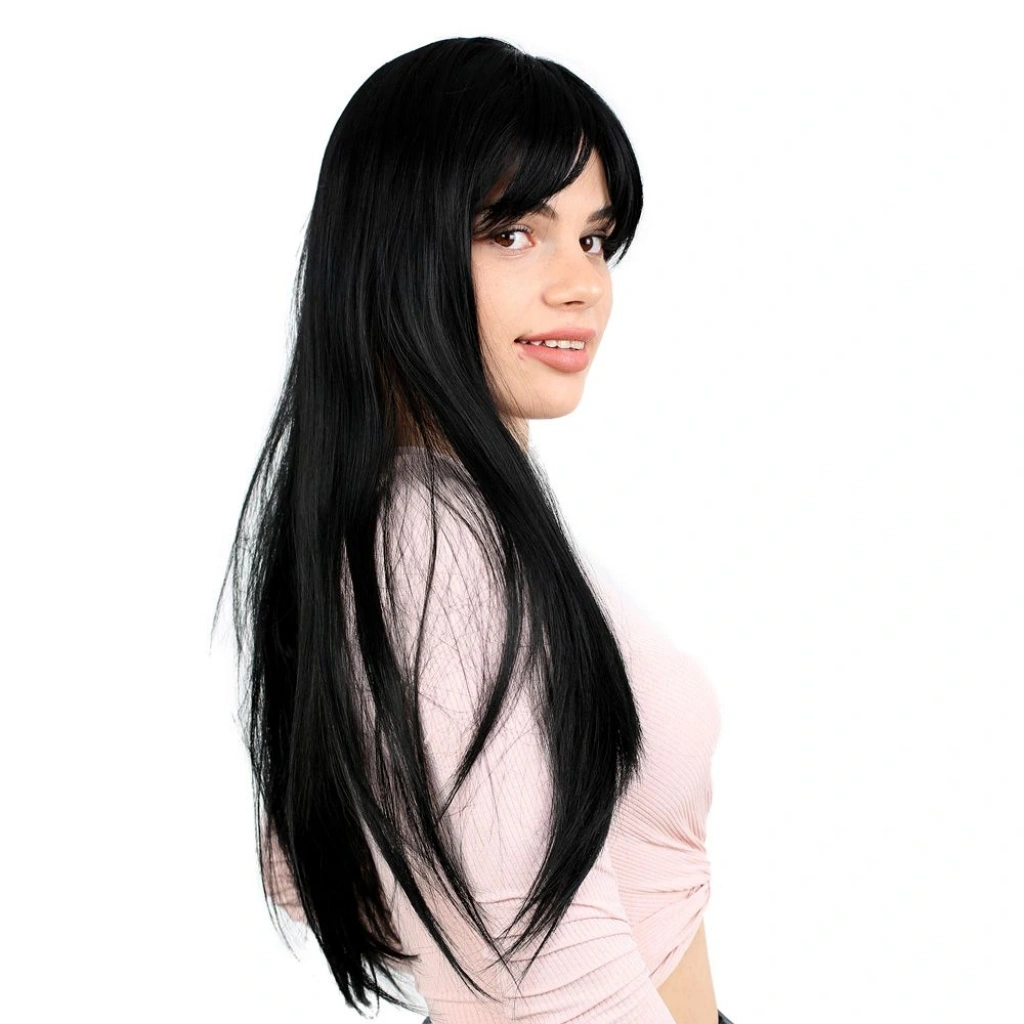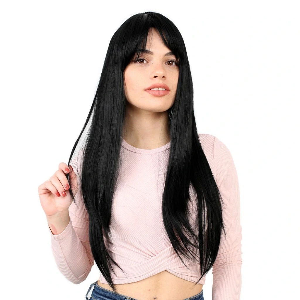 Fiber Sentetik Uzun Düz Kahküllü Peruk - Siyah1.Sınıf fiber sentetiktir.Uzun, düz ve kahküllü bir modeldir.Tepe hariç 65 cm ve sadece saç 260 gr civarındadır.Gerçek görünüme yakındır ve parlama yapmaz.İçi filelidir, hava alabilen özel bir yapısı vardır.İç arka kısmında baş ölçünüze göre ayarlanabilir kopçaları mevcuttur, her kafa yapısına uyum sağlayabilir.Takmadan önce saçlarınızı bir bone ile toplayıp kapatırsanız, kayma veya düşme gibi sorunlarla karşılaşmazsınız.130-140 dereceyi geçmemesi koşuluyla maşa ve fön uygulanabilir.Düzleştirebilirsiniz.Yıkanabilir, taranabilir.Ilık ve kremli bir su karışımı içinde durulayıp yıkayabilirsiniz.Yıkama sonrasında kurumaya bırakın,kuruduktan sonra mavi su sıkıp uçlardan dibe doğru hafifçe tarayınız, sonrasında kullanabilirsiniz,yada bir kafa mankeni üzerinde muhafaza edebilirsiniz.Tülerme, elektriklenme vb. problemlerin önüne geçmek için; her takıp çıkardıktan sonra mavi su sıkıp taramanızı tavsiye ederiz.