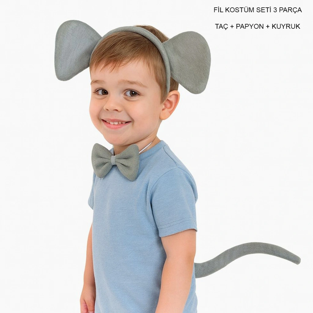Fil Kostüm Seti 3 Parça, çocukların okul gösterilerinde, etkinliklerde ve özel günlerde rahatlıkla kullanabileceği sevimli ve hafif bir kostüm setidir.Set içeriğinde: Fil Taçı Fil Papyonu Fil Kuyruğu yumuşak dokulu kumaştan üretilmiştir. Çocukların baş ve boyun yapısına uyum sağlar, hareketlerini kısıtlamaz. Anaokulu ve ilkokul gösterileri, tiyatro sahneleri, kostüm partileri ve özel etkinlikler için uygundur.Kullanım Alanları: Okul & anaokulu gösterileri Sahne ve tiyatro etkinlikleri Kostüm partileri Hayvan temalı organizasyonlar