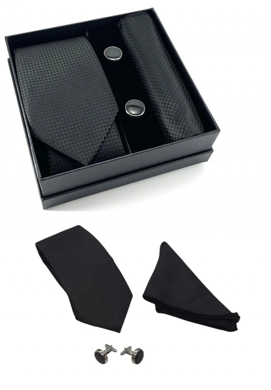 Kravat Düğme Set Siyah Desenli Kravat Mendil Kol Düğmesi Özel Set Erkeklere alabileceğiniz en güzel hediye. Hem ŞIK hem Kaliteli SET İÇERİĞİ :Kravat Genişliği 7-cm - Boyu 150 cmKendi Kumaşından Kombin Mendil  ve Kol Düğmesi olarak 3 parçadan oluşurÖzel Kutusu ile Gönderilmektedir.