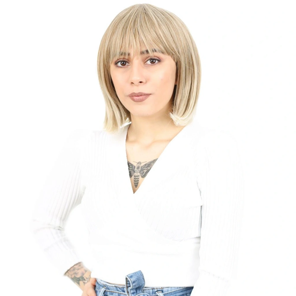 Küt Kahküllü Fiber Sentetik Peruk - Karamel / Platin Röfleli1.Sınıf fiber sentetiktir.Kısa, düz küt ve kahküllü bir modeldir.Tepe hariç 25 - 30 cm ve 190 - 200 gr civarındadır.Gerçek görünüme yakındır ve parlama yapmaz.İçi filelidir, hava alabilen özel bir yapısı vardır.İç arka kısmında baş ölçünüze göre ayarlanabilir kopçaları mevcuttur, her kafa yapısına uyum sağlayabilir.Takmadan önce saçlarınızı bir bone ile toplayıp kapatırsanız, kayma veya düşme gibi sorunlarla karşılaşmazsınız.130-140 dereceyi geçmemesi koşuluyla maşa ve fön uygulanabilir.Düzleştirebilirsiniz.Yıkanabilir, taranabilir.Ilık ve kremli bir su karışımı içinde durulayıp yıkayabilirsiniz.Yıkama sonrasında kurumaya bırakın,kuruduktan sonra mavi su sıkıp uçlardan dibe doğru hafifçe tarayınız, sonrasında kullanabilirsiniz,yada bir kafa mankeni üzerinde muhafaza edebilirsiniz.Tülerme, elektriklenme vb. problemlerin önüne geçmek için; her takıp çıkardıktan sonra mavi su sıkıp taramanızı tavsiye ederiz.