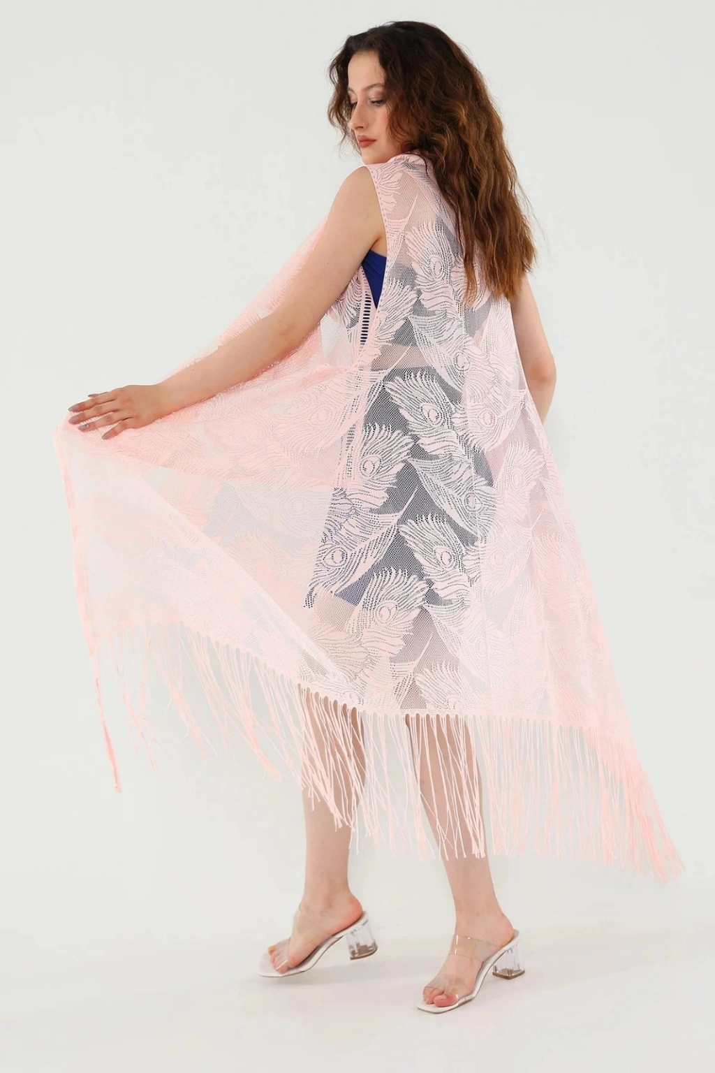 Pareo Dantel Yelek Mayo Bikini Üzeri Yaprak Desenli Püsküllü Plaj Elbisesi - Açık Pembe