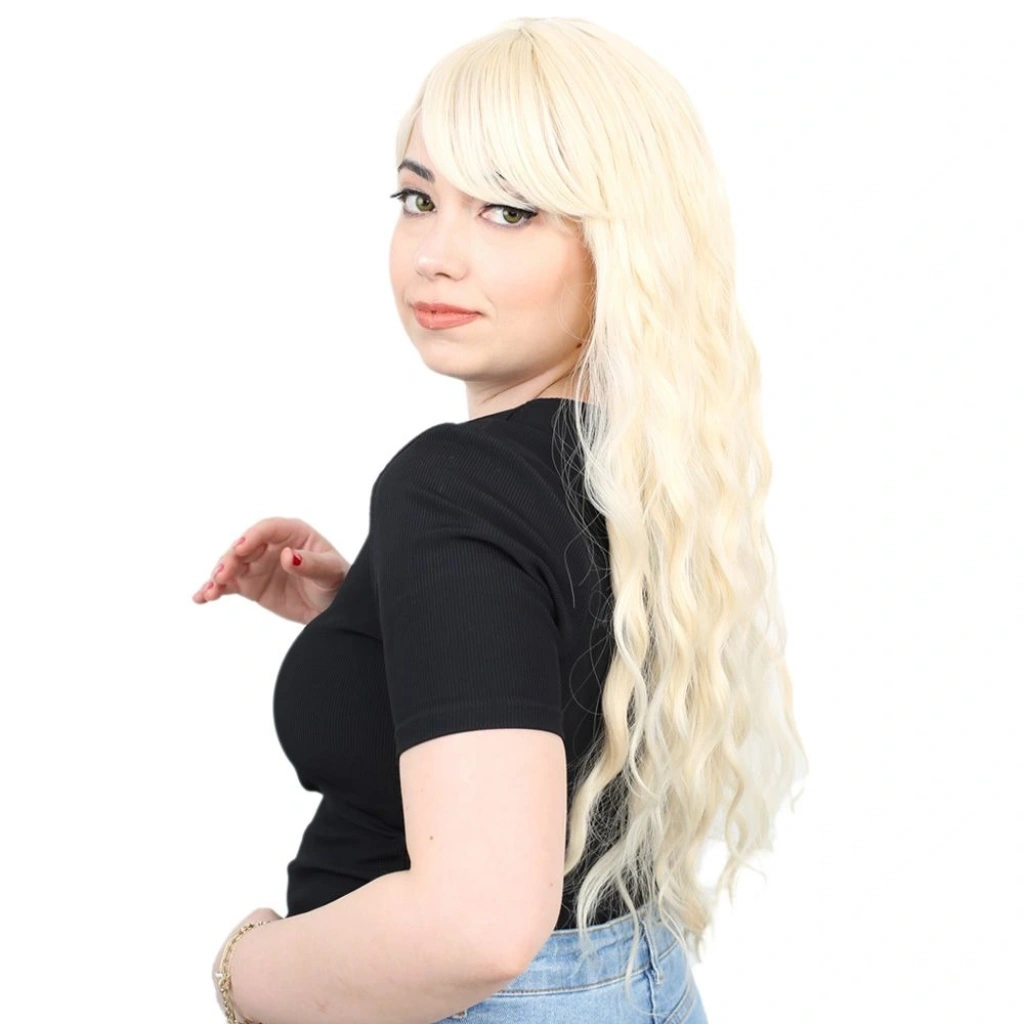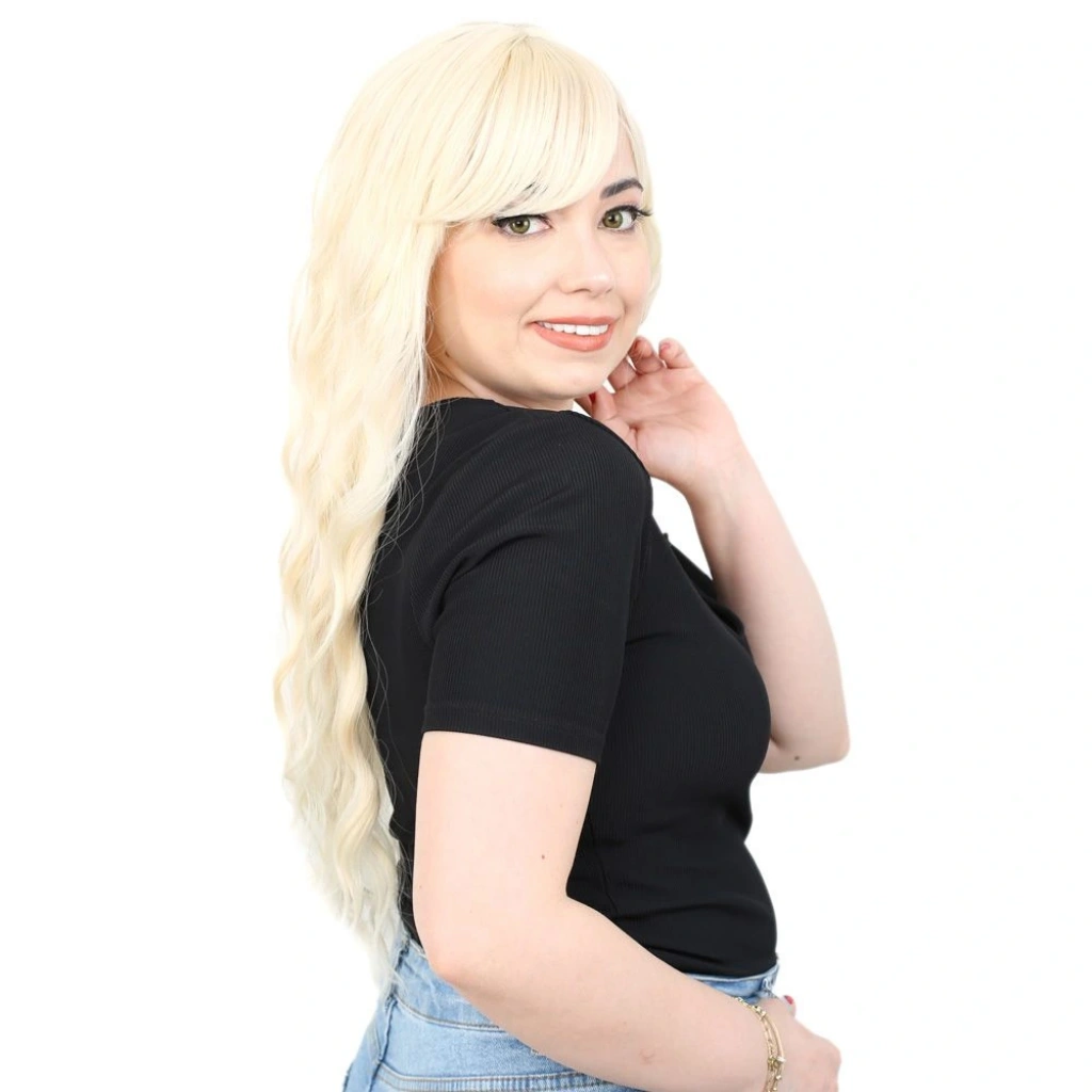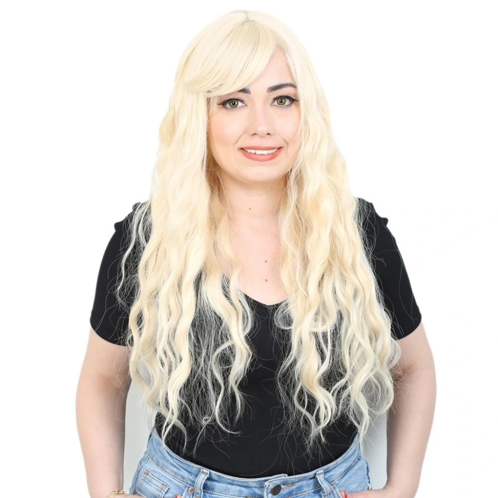 Perçemli Uzun Su Dalgası Fiber Sentetik Peruk - Platin1.Sınıf fiber sentetiktir.Uzun, su dalgası ve perçemli bir modeldir.Tepe hariç 60 cm ve sadece saç 248 gr civarındadır.Gerçek görünüme yakındır ve parlama yapmaz.İçi filelidir, hava alabilen özel bir yapısı vardır.İç arka kısmında baş ölçünüze göre ayarlanabilir kopçaları mevcuttur, her kafa yapısına uyum sağlayabilir.Takmadan önce saçlarınızı bir bone ile toplayıp kapatırsanız, kayma veya düşme gibi sorunlarla karşılaşmazsınız.130-140 dereceyi geçmemesi koşuluyla maşa ve fön uygulanabilir.Yıkanabilir, taranabilir.Ilık ve kremli bir su karışımı içinde durulayıp yıkayabilirsiniz.Yıkama sonrasında kurumaya bırakın,kuruduktan sonra mavi su sıkıp uçlardan dibe doğru hafifçe tarayınız, sonrasında kullanabilirsiniz,yada bir kafa mankeni üzerinde muhafaza edebilirsiniz.Tülerme, elektriklenme vb. problemlerin önüne geçmek için; her takıp çıkardıktan sonra mavi su sıkıp taramanızı tavsiye ederiz.Dalga yapısı, düzleştirilmediği sürece bozulmaz.