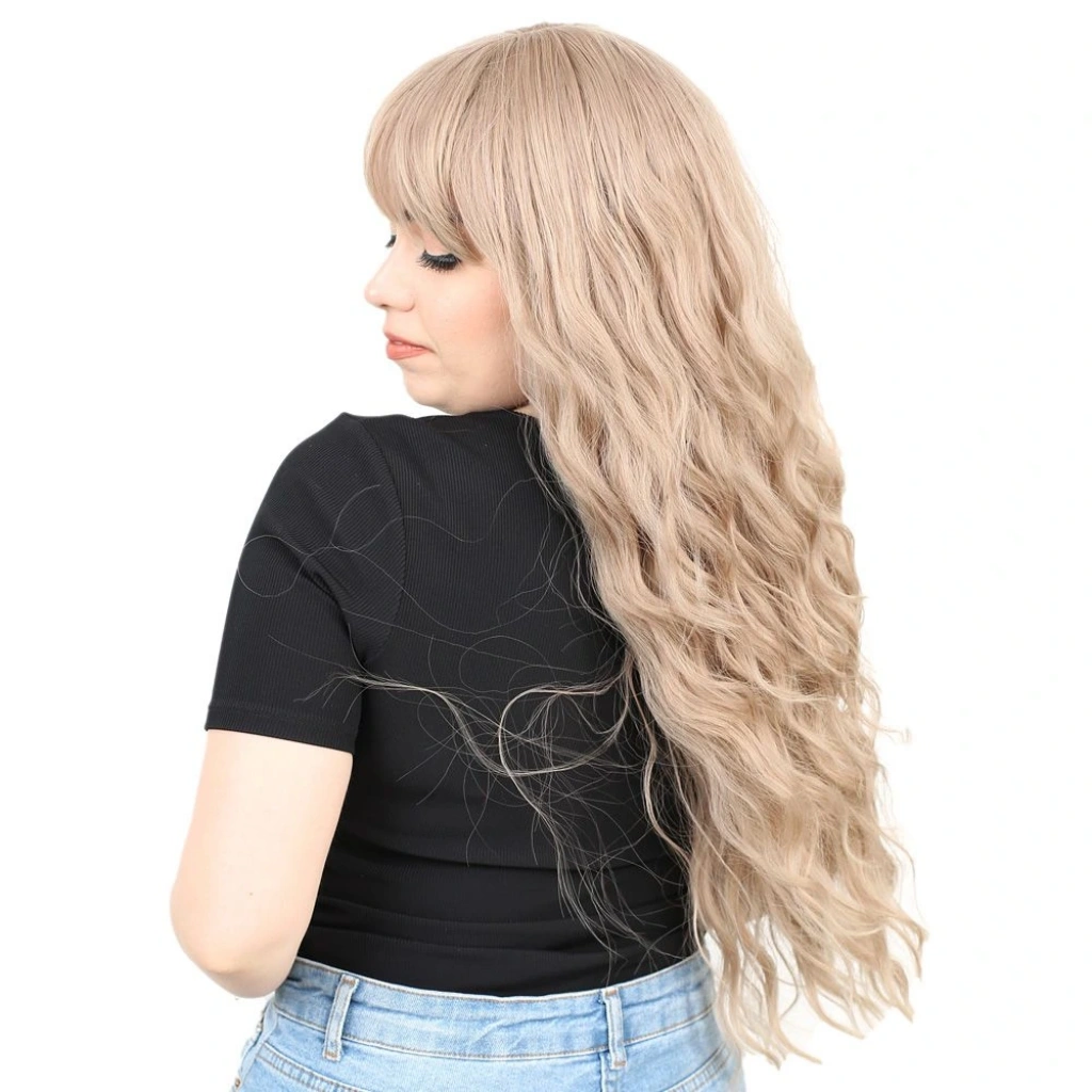 Perçemli Uzun Su Dalgası Fiber Sentetik Peruk- Küllü Bebek Sarı1.Sınıf fiber sentetiktir.Uzun, su dalgası ve perçemli bir modeldir.Tepe hariç 60 cm ve sadece saç 248 gr civarındadır.Gerçek görünüme yakındır ve parlama yapmaz.İçi filelidir, hava alabilen özel bir yapısı vardır.İç arka kısmında baş ölçünüze göre ayarlanabilir kopçaları mevcuttur, her kafa yapısına uyum sağlayabilir.Takmadan önce saçlarınızı bir bone ile toplayıp kapatırsanız, kayma veya düşme gibi sorunlarla karşılaşmazsınız.130-140 dereceyi geçmemesi koşuluyla maşa ve fön uygulanabilir.Yıkanabilir, taranabilir.Ilık ve kremli bir su karışımı içinde durulayıp yıkayabilirsiniz.Yıkama sonrasında kurumaya bırakın,kuruduktan sonra mavi su sıkıp uçlardan dibe doğru hafifçe tarayınız, sonrasında kullanabilirsiniz,yada bir kafa mankeni üzerinde muhafaza edebilirsiniz.Tülerme, elektriklenme vb. problemlerin önüne geçmek için; her takıp çıkardıktan sonra mavi su sıkıp taramanızı tavsiye ederiz.Dalga yapısı, düzleştirilmediği sürece bozulmaz.